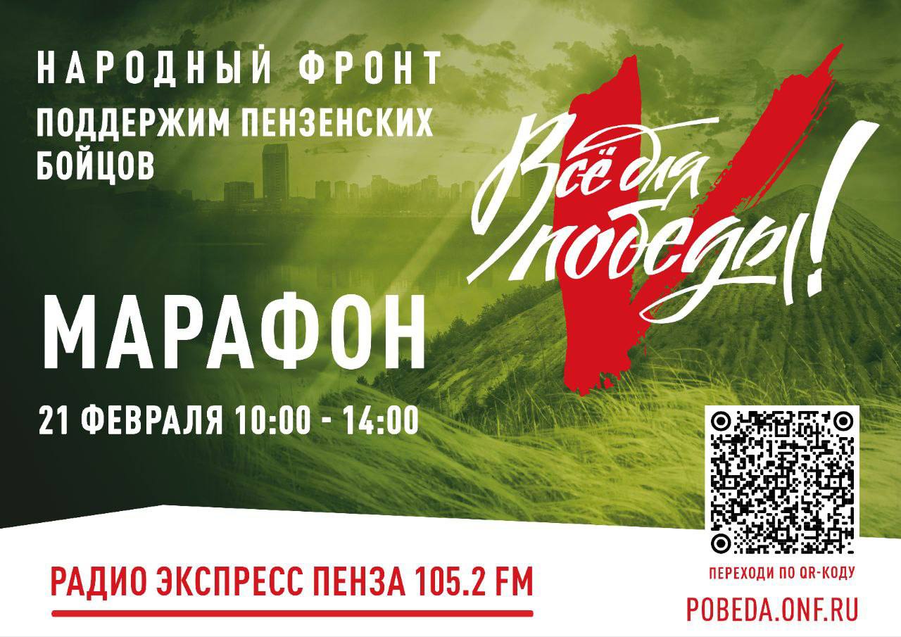 21.02.2023 общественным движением "Народный фронт "За Россию" проводится региональный благотворительный марафон "Все для Победы!", собранные средства пойдут на закупку дополнительного оборудования и снаряжения для мобилизованных и добровольцев с Пензенской области.